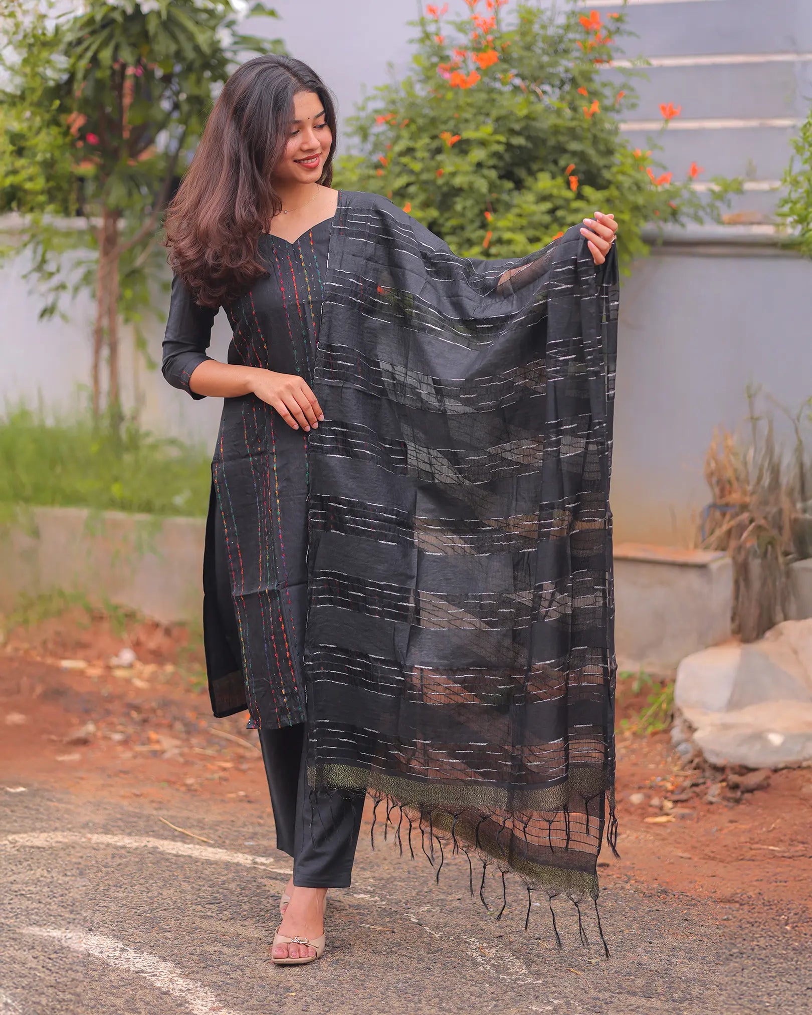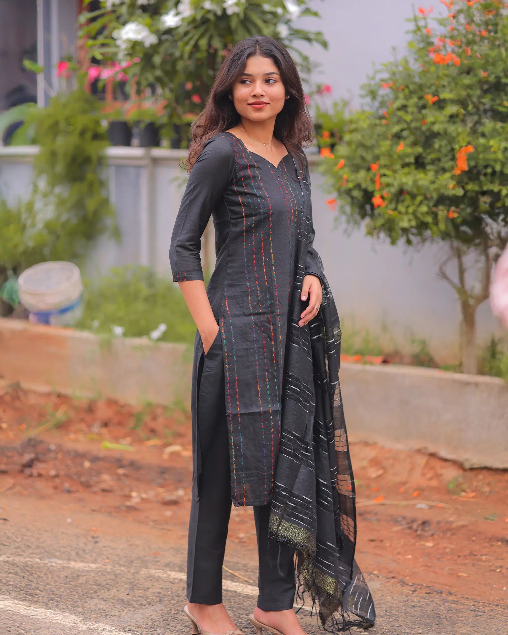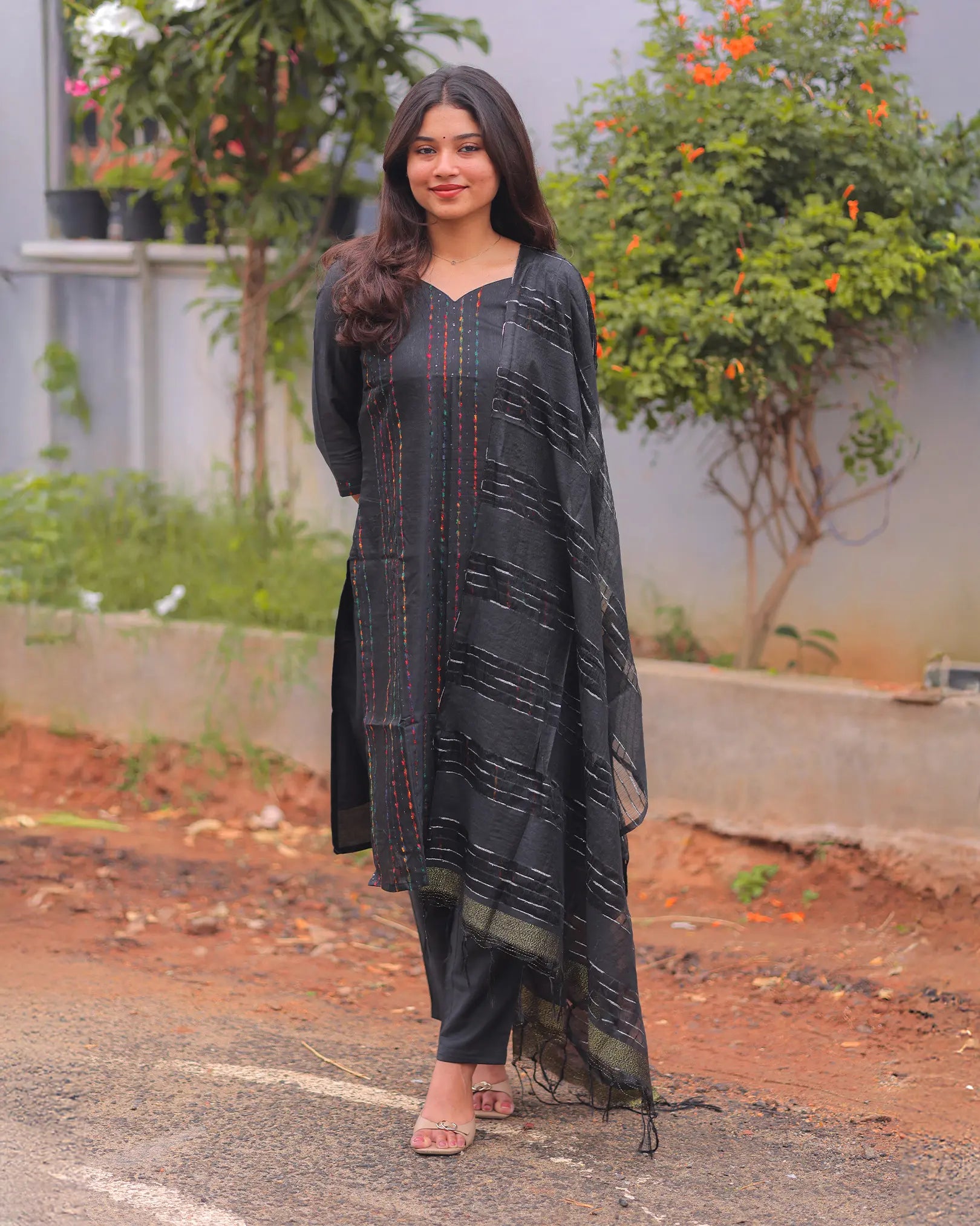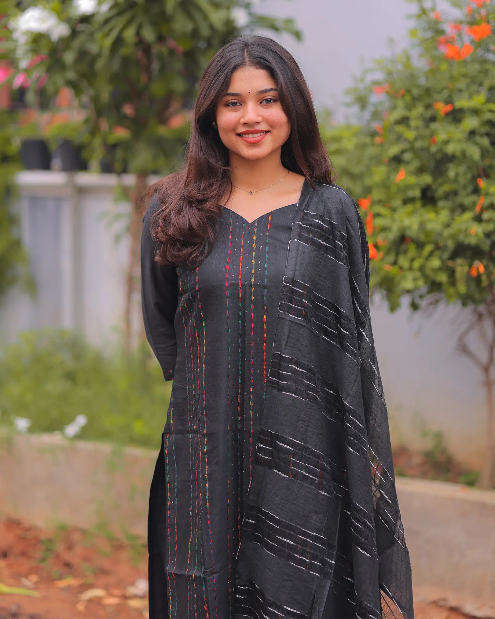 Product Features: Material: Cotton Silk Sleeve: 3/4 sleeve Lining: Yes Pant: Two pockets Pattern: Kurti: Features a repeating ikat-style diamond motif in white, vertically aligned. Dupatta: Plain beige-tan body with a blue zari-woven border, small triangular designs, and black knotted tassels. Versatility: This ensemble...