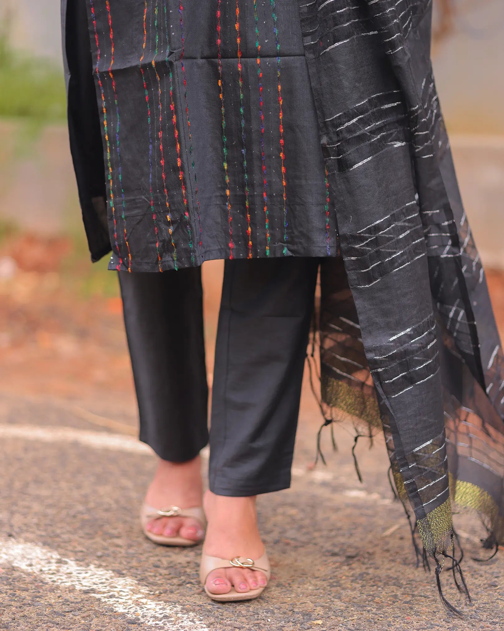 Product Features: Material: Cotton Kurta Style: Straight-cut kurta Sleeves: Elbow-length sleeves with light zari embellishments Neckline: Round neck with slight notch and button detailing Length: Calf-length with side slits Pattern: Intricate floral print in light gold across the kurta, pants, and dupatta Printed tree...